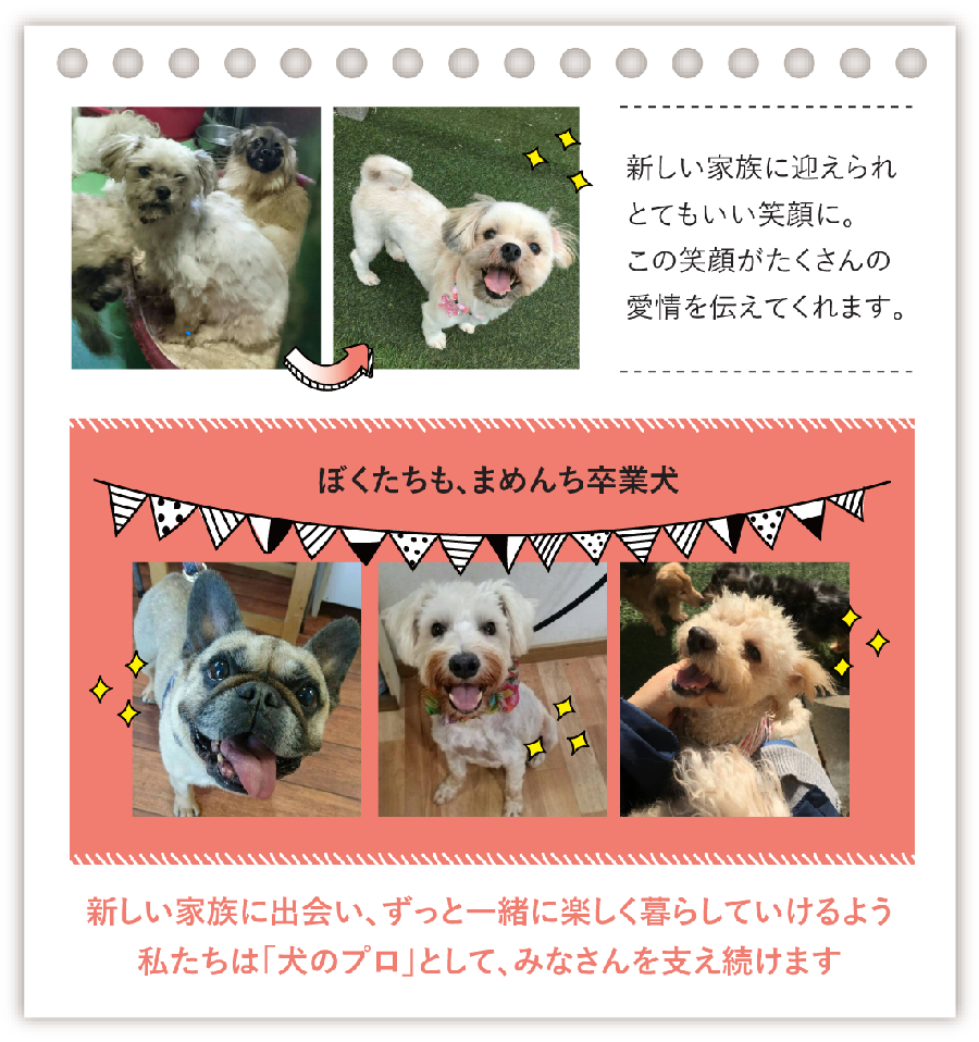 犬の知識が足りず、正しいしつけ・手入れ不足で手に負えなくなった、家族が病気になり飼えなくなった…などの理由で、悲しい想いをしている犬たちがいます。