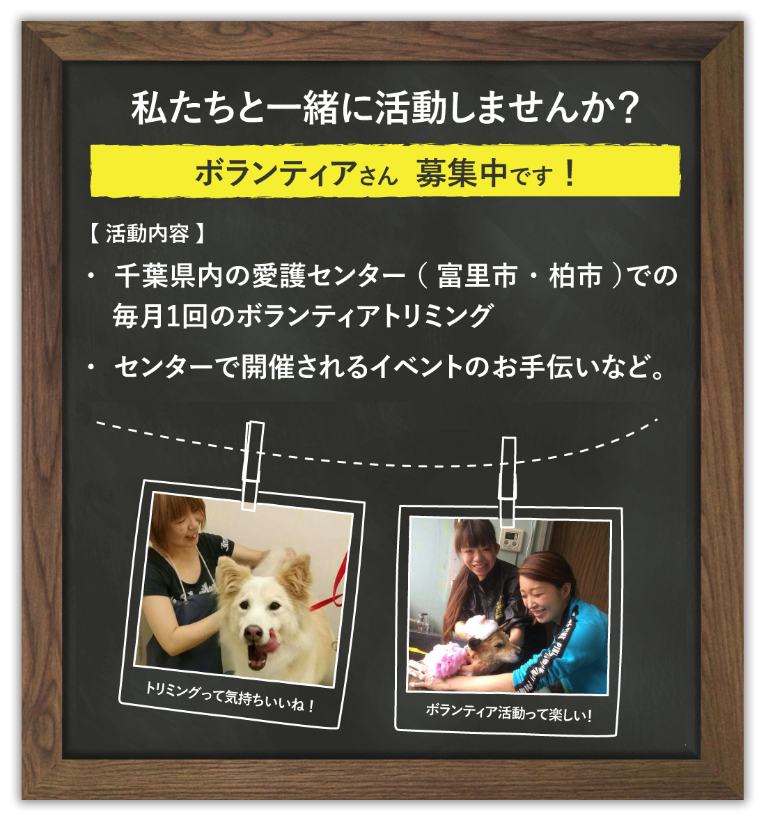千葉県動物愛護センター本所(富里市)、東葛飾支所(柏市)にて毎月、収容犬のトリミングをボランティア(通称:ボラトリ)で行っています。
